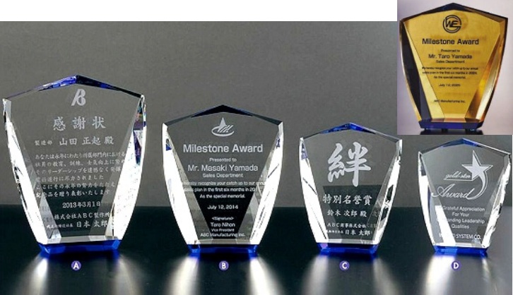 型番 | サイズ mm | サンドブラスト込 | 2Dレーザー込 | カラー印刷込 | 金箔+ 表面印刷 |